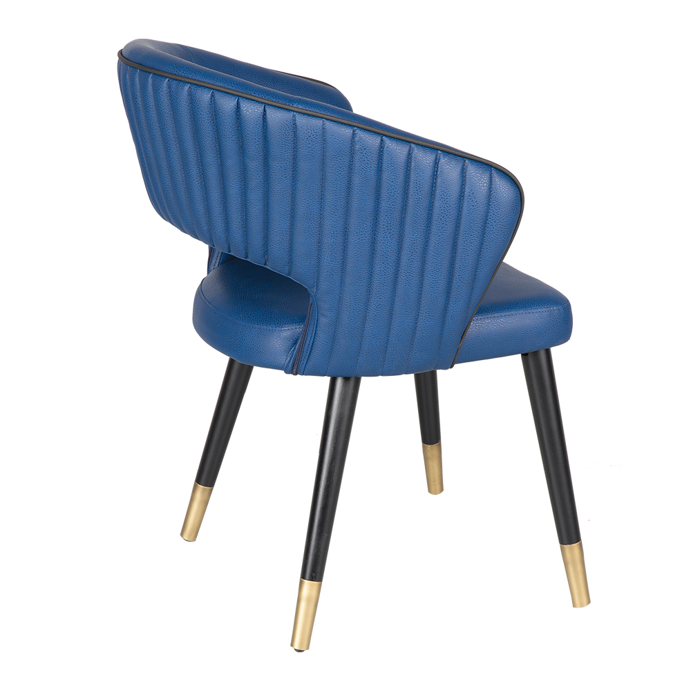 Dieser Stuhl verbindet ein modernes Design mit raffinierten Details. Die halbrunde Rückenlehne mit seitlich integrierten Armlehnen bietet hohen Sitzkomfort, während die markanten vertikalen Ziernähte auf der Rückseite ein stilvolles Designelement darstellen. Die dezente Aussparung im unteren Rückenbereich verleiht dem Stuhl zusätzliche Leichtigkeit.