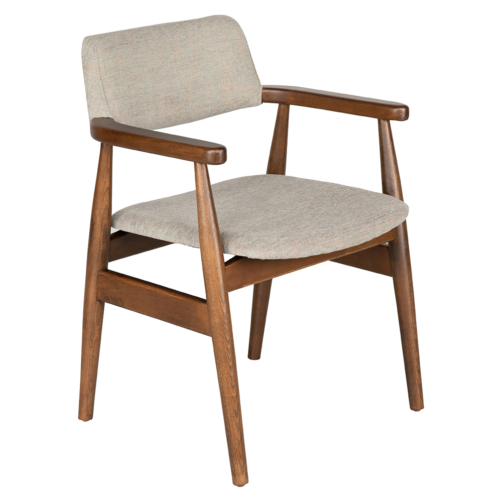 Dieser Stuhl vereint klassische Schlichtheit mit hohem Komfort. Die gerade Rückenlehne und die gepolsterte Sitzfläche sorgen für bequemes Sitzen, während die dezenten Armlehnen zusätzlichen Halt bieten. Der Stoffbezug verleiht dem Modell eine natürliche, wohnliche Ausstrahlung.