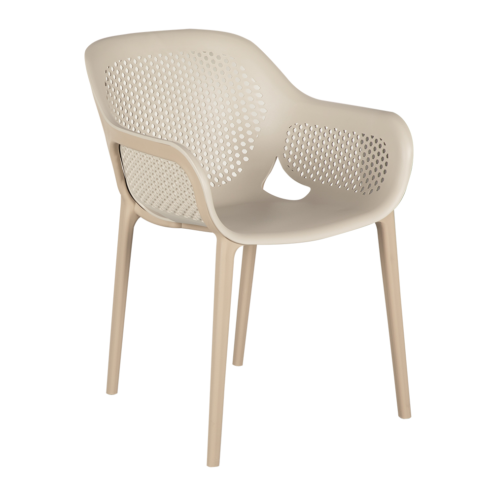 Dieser moderne Kunststoffstuhl überzeugt durch seine leichte, luftige Formensprache und die durchbrochene Struktur, die ihm eine frische und zeitgemäße Optik verleiht. Dank der stabilen Ausführung aus Polypropylen ist er sowohl robust als auch pflegeleicht und damit ideal für den intensiven Einsatz in Gastronomie, Außenbereichen oder modernen Wohnräumen. Die ergonomische Sitzschale mit Armlehnen bietet zusätzlichen Komfort, während das stapelbare Design für flexible Einsatzmöglichkeiten sorgt. Ein vielseitiger Stuhl, der Funktionalität und stilvolles Design perfekt verbindet und gleichzeitig durch seine Langlebigkeit überzeugt.