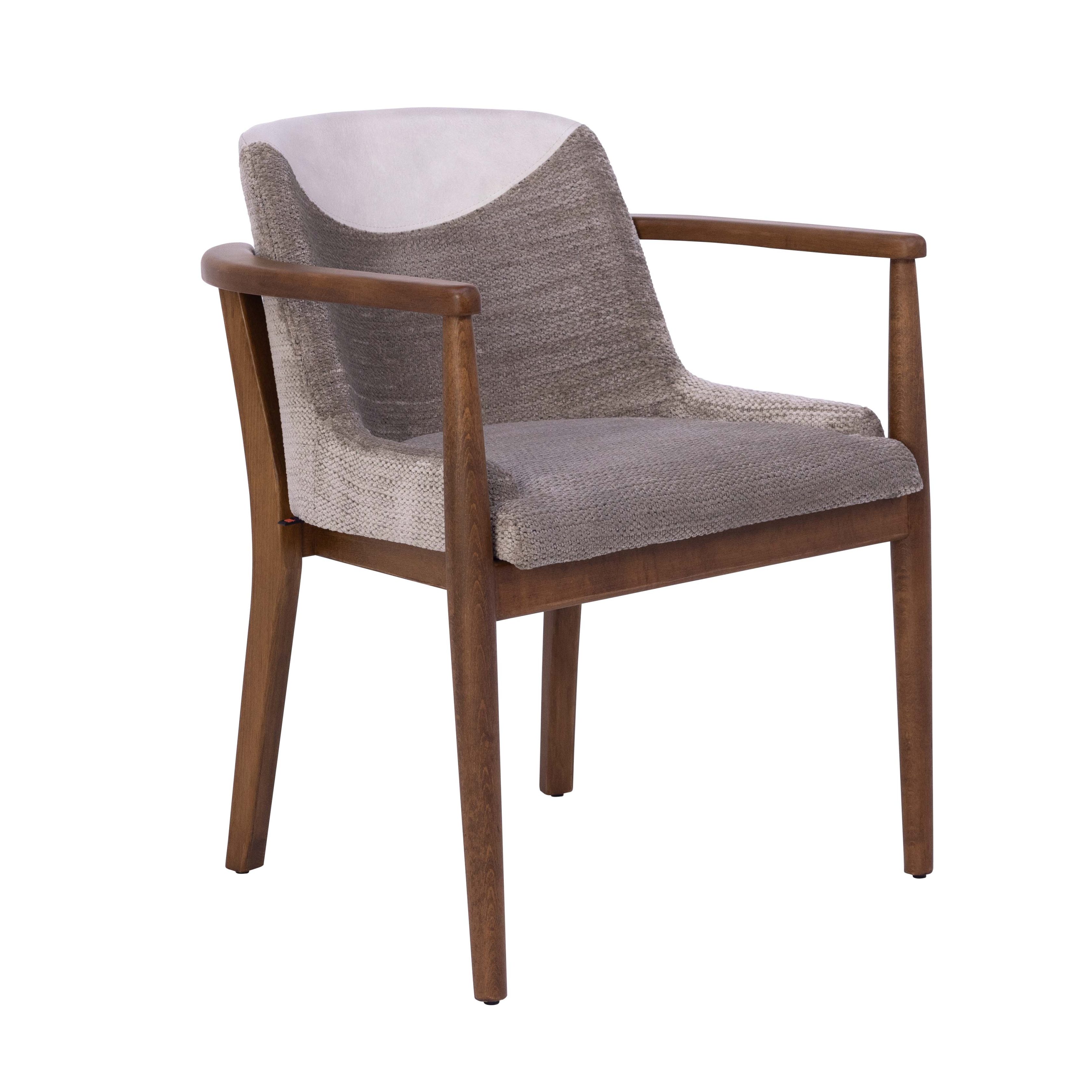 Dieser Stuhl vereint moderne Eleganz mit hohem Komfort. Die weich gepolsterte Sitzfläche und Rückenlehne sind mit einem pflegeleichten Polyurethan-Bezug versehen und bieten bequemes Sitzen. Durch die leicht geschwungene Form der Rückenlehne entsteht ein harmonisches Gesamtbild, das von den schlichten Armlehnen aus Holz ergänzt wird.