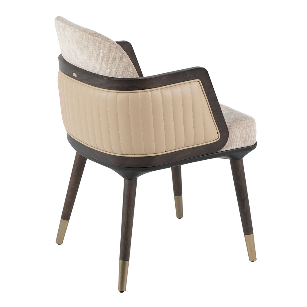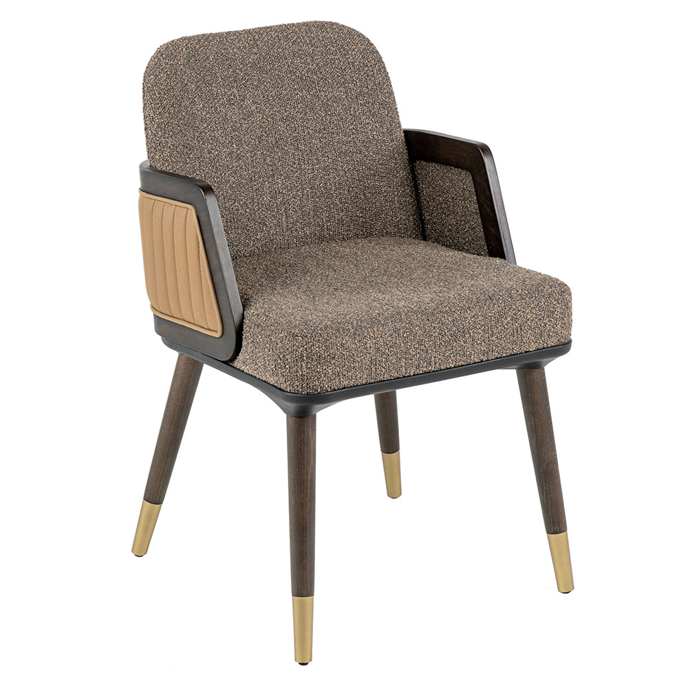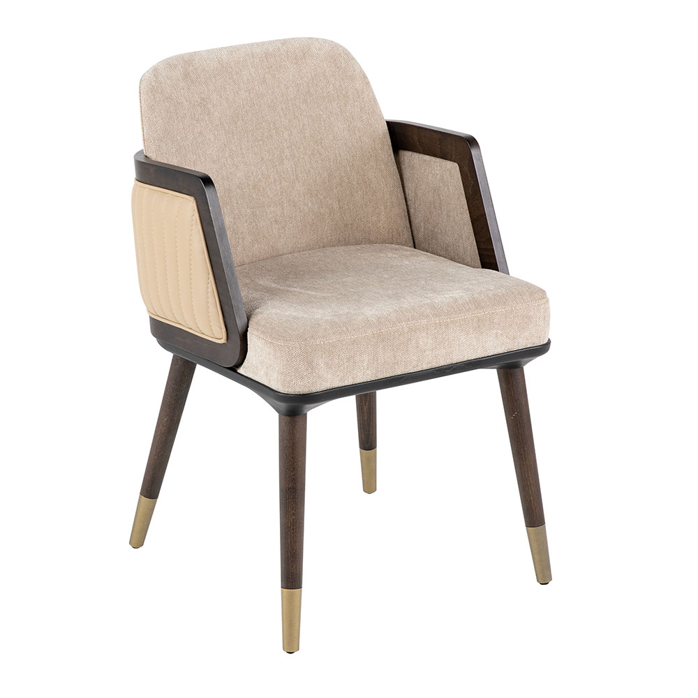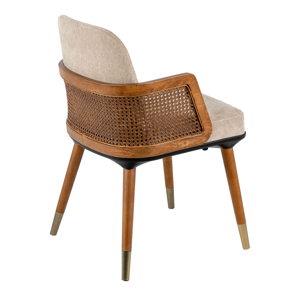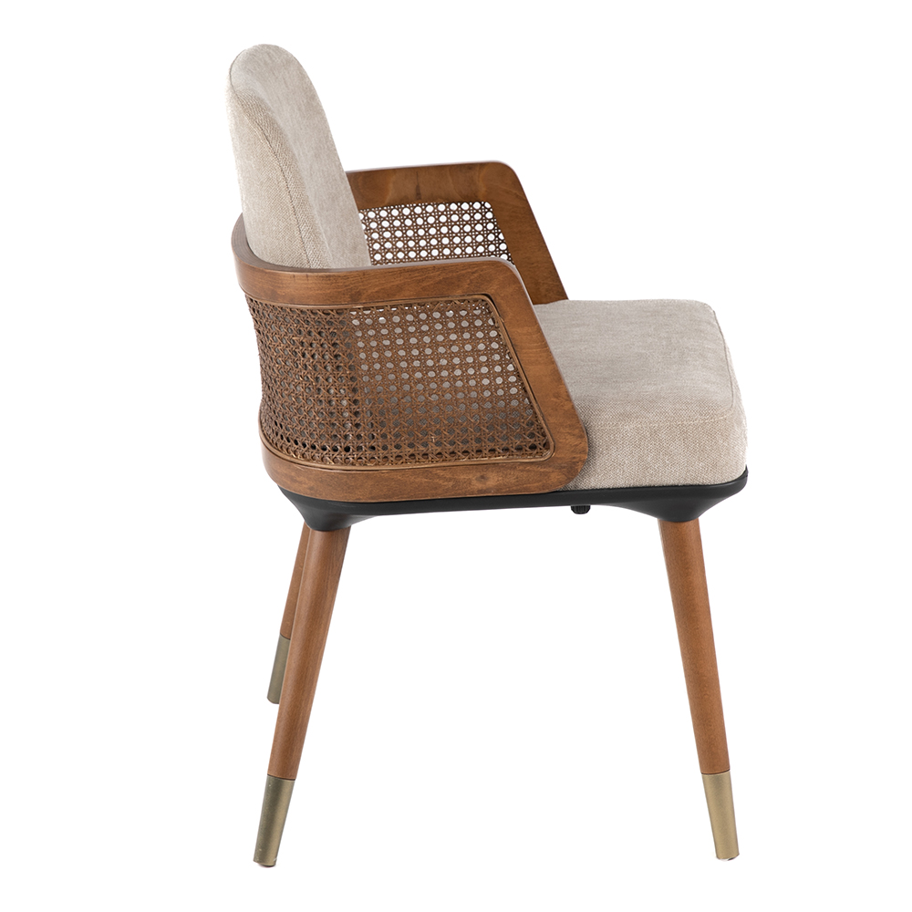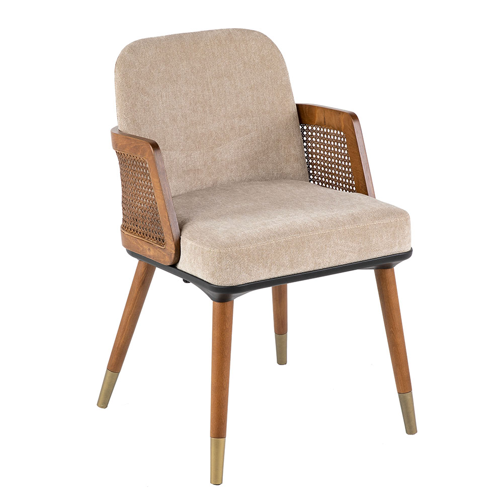Dieser Stuhl verbindet modernen Komfort mit klassischem Charme. Die weiche Polsterung in neutralen Farbtönen sorgt für ein angenehmes Sitzgefühl, während die seitlichen Armlehnen mit ihrem geflochtenen Holzeinsatz einen eleganten Akzent setzen. Das stabile Massivholzgestell mit konisch zulaufenden Beinen verleiht zusätzliche Standfestigkeit und ist in den Farbvarianten Natur, heller Nussbaum oder dunkler Nussbaum erhältlich. Dank der hochwertigen Verarbeitung eignet sich das Modell sowohl für private Wohnbereiche als auch für stilvolle Gastronomieumgebungen. Zum Preis von zweihundert Euro bietet es ein harmonisches Zusammenspiel aus Komfort, Design und Langlebigkeit. Mit seiner edlen Optik wird er schnell zum Blickfang in jedem Raum und lässt sich mühelos in verschiedene Einrichtungskonzepte integrieren.