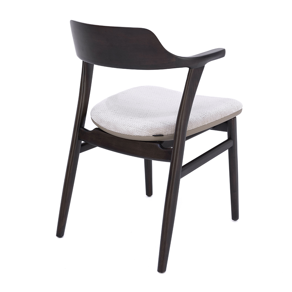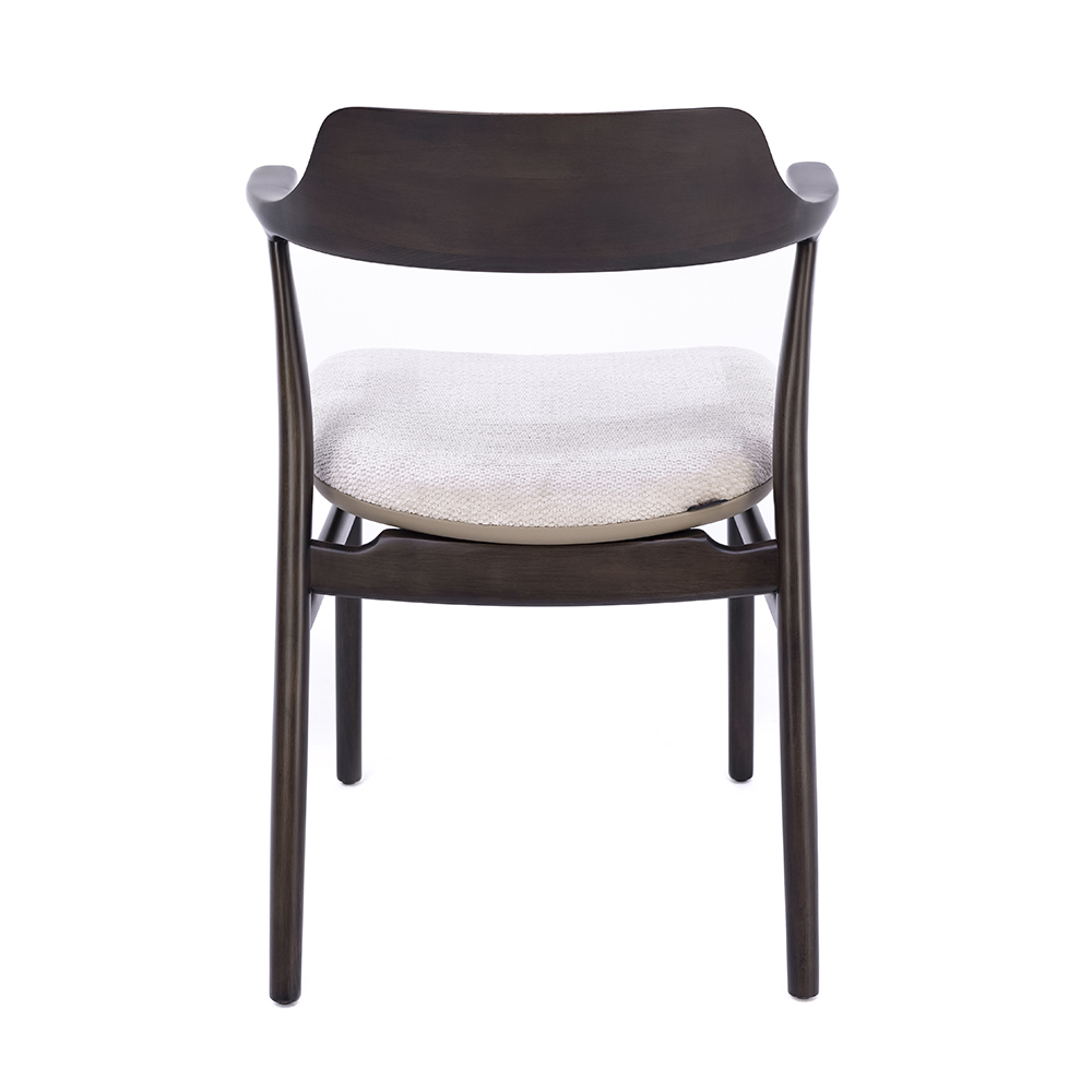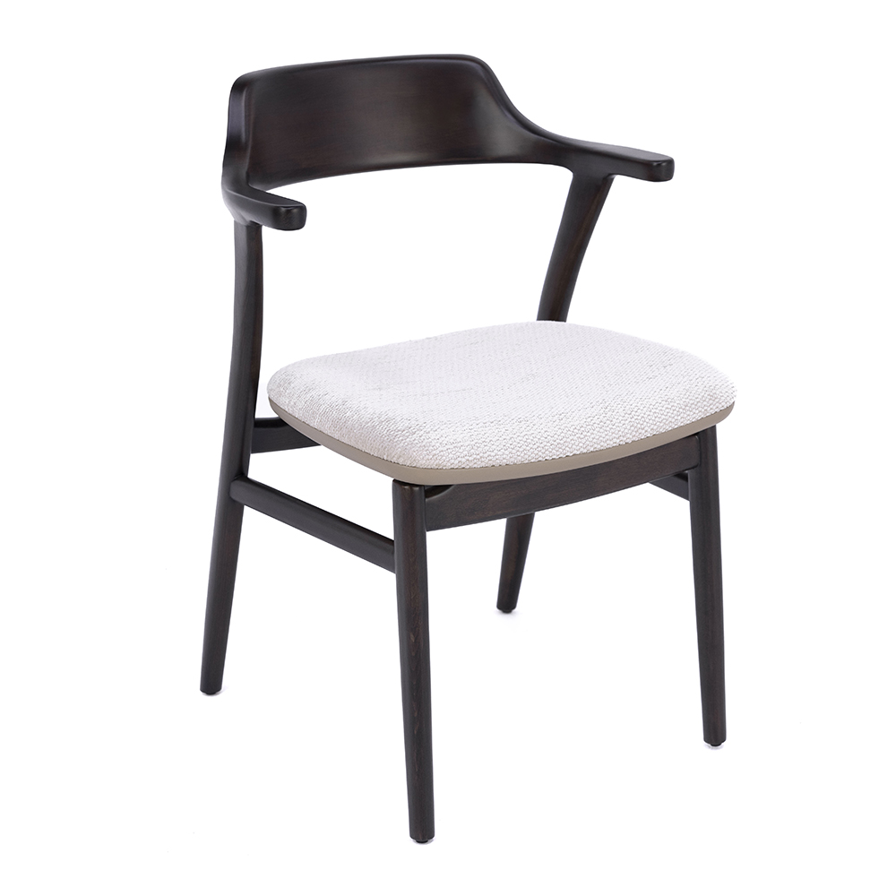 Dieser Stuhl verbindet klassische Eleganz mit moderner Zurückhaltung. Das robuste Holzgestell verleiht ihm Stabilität, während die geschwungene Rückenlehne mit integrierten Armauflagen für zusätzlichen Komfort sorgt. Das gepolsterte Sitzkissen hebt sich stilvoll vom dunklen Rahmen ab und macht das Möbelstück sowohl für lange Dinnerabende als auch für kurze Pausen besonders angenehm. Durch seine schlichte Formensprache fügt er sich harmonisch in verschiedene Einrichtungsstile ein und verleiht jedem Raum eine einladende Note. Die feine Verarbeitung der Holzoberfläche unterstreicht die hohe Qualität und sorgt für eine besonders langlebige Nutzung. Ob in Restaurants, Cafés oder im privaten Essbereich – dieser Stuhl schafft ein Ambiente, das Stil und Bequemlichkeit ideal miteinander verbindet.