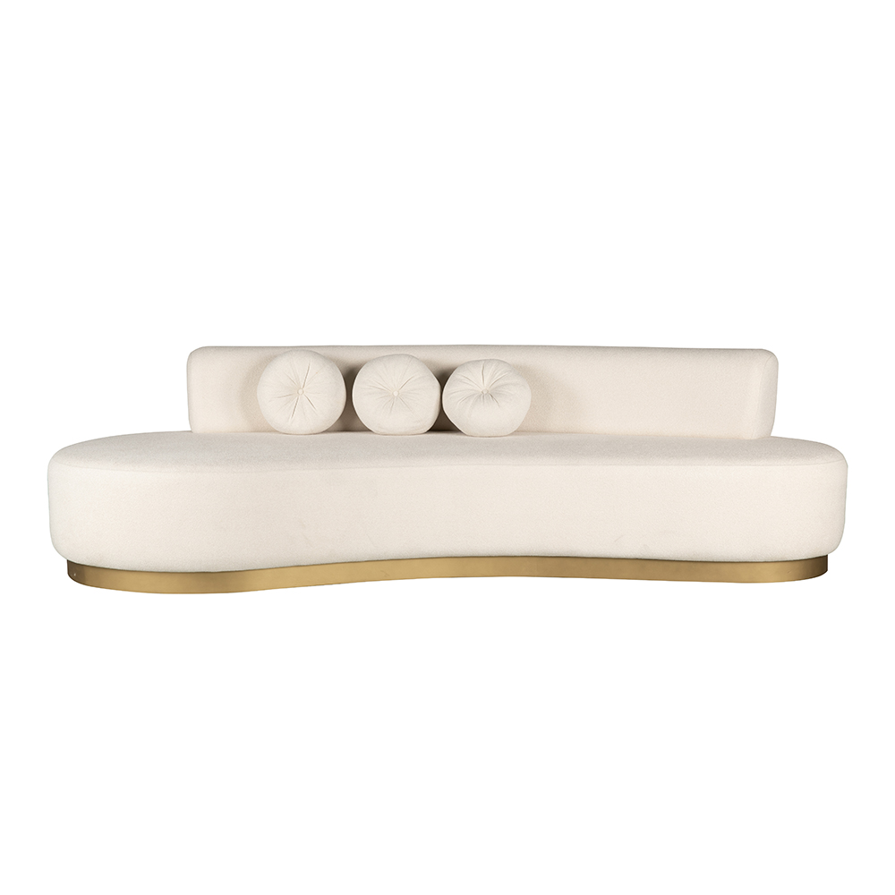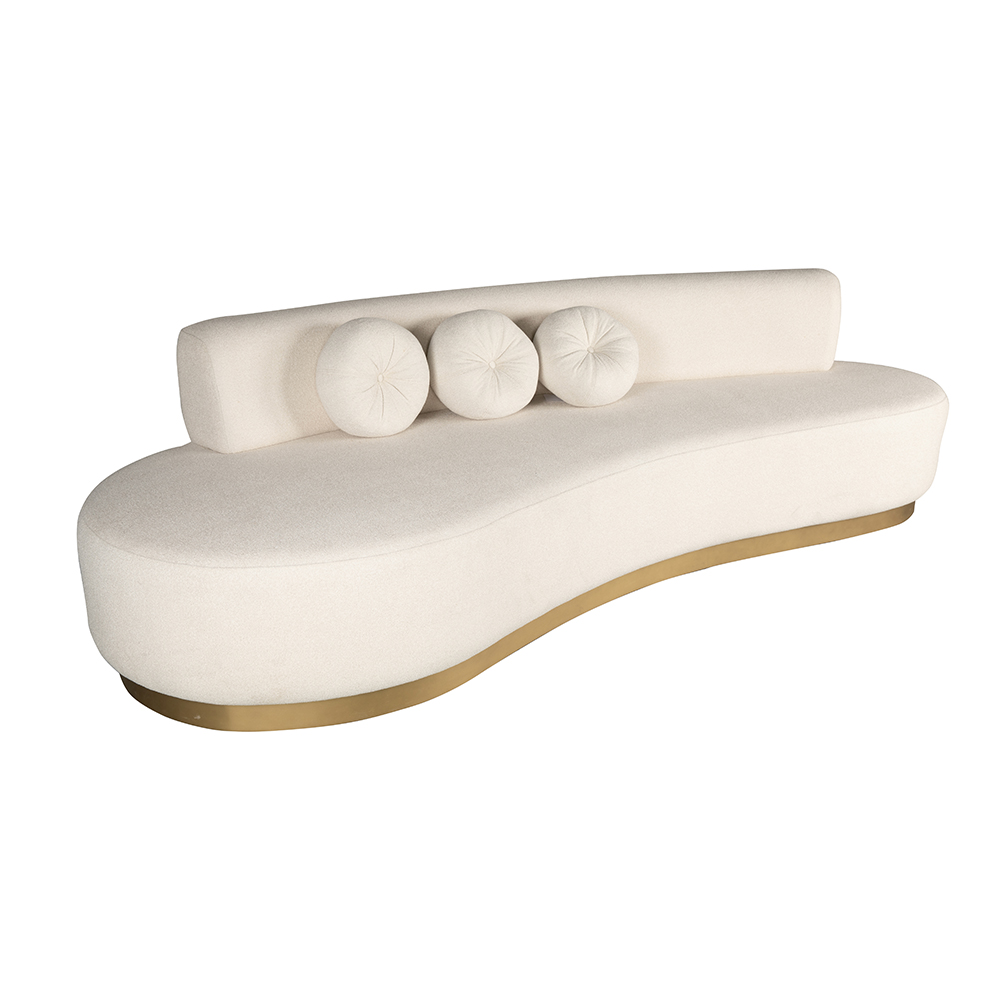 Dieses extravagante Sofa beeindruckt durch seine organische Form und die edle Gestaltung. Die sanft geschwungene Linienführung schafft eine moderne, skulpturale Optik, die jedem Raum eine besondere Ausstrahlung verleiht. Die großzügige Sitzfläche ist komfortabel gepolstert und mit einer eleganten Rückenlehne ausgestattet, die durch drei dekorative Rundkissen stilvoll akzentuiert wird. Der goldfarbene Sockel setzt einen luxuriösen Kontrast zum hellen Bezug und unterstreicht den hochwertigen Charakter des Designs. Ideal geeignet für Hotellobbys, Lounges oder repräsentative Wohnbereiche vereint dieses Sofa außergewöhnliche Formgebung mit exklusivem Komfort und zeitloser Eleganz.