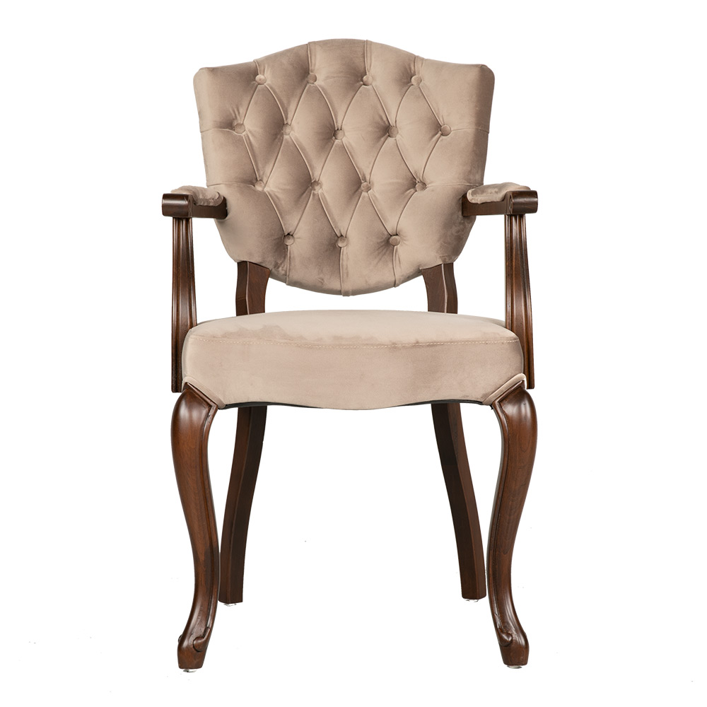 Dieses Modell strahlt mit seiner eleganten Formensprache und den fein gearbeiteten Details klassische Noblesse aus. Die gepolsterte Sitzfläche und die hochwertig verarbeitete Rückenlehne mit Knopfheftung bieten ein komfortables Sitzgefühl, das durch die geschwungenen Armlehnen stilvoll ergänzt wird. Es ist ideal für gehobene Esszimmer, elegante Cafés oder repräsentative Empfangsbereiche. Seine zeitlose Ausstrahlung und vielseitige Einsetzbarkeit machen es zu einem Möbelstück, das Eleganz und Komfort harmonisch vereint.