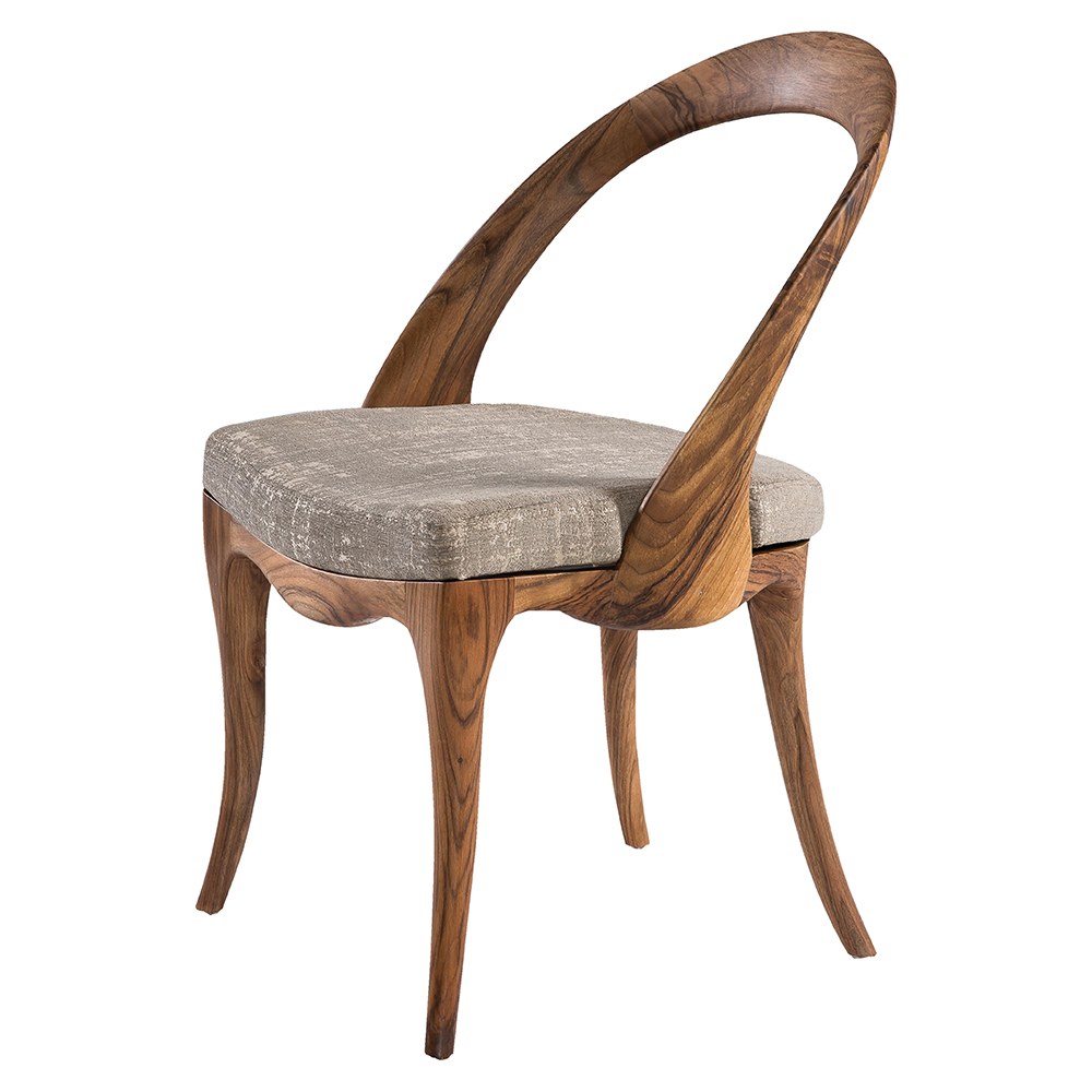 Dieser außergewöhnliche Stuhl ist ein Meisterwerk handwerklicher Gestaltung und verbindet organische Formen mit edlem Holzdesign. Die geschwungene Rückenlehne geht nahtlos in die elegant geformten Hinterbeine über und verleiht dem Stuhl eine skulpturale Anmutung. Die Sitzfläche ist weich gepolstert und mit einem dezenten Stoffbezug versehen, der Komfort und Stil harmonisch kombiniert. Das massive Holzgestell in verschiedenen Beiztönen sorgt für Stabilität und unterstreicht die exklusive Ausstrahlung. Perfekt geeignet für gehobene Essbereiche, luxuriöse Wohnräume oder repräsentative Einrichtungen ist dieser Stuhl ein echtes Statement-Piece, das Funktionalität und künstlerische Eleganz vereint.