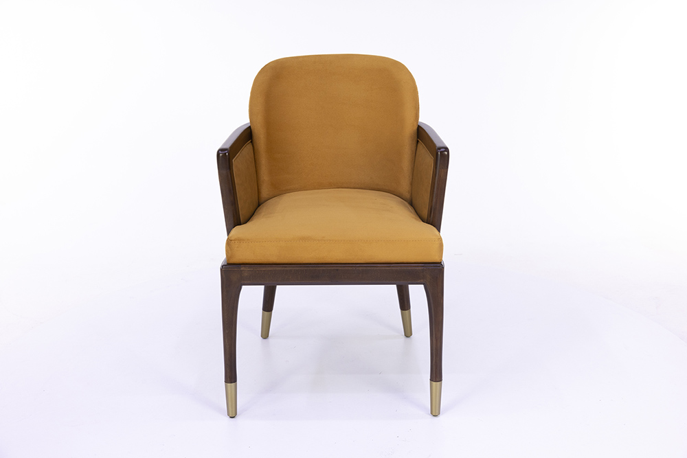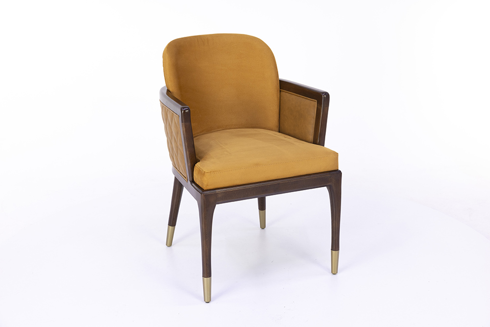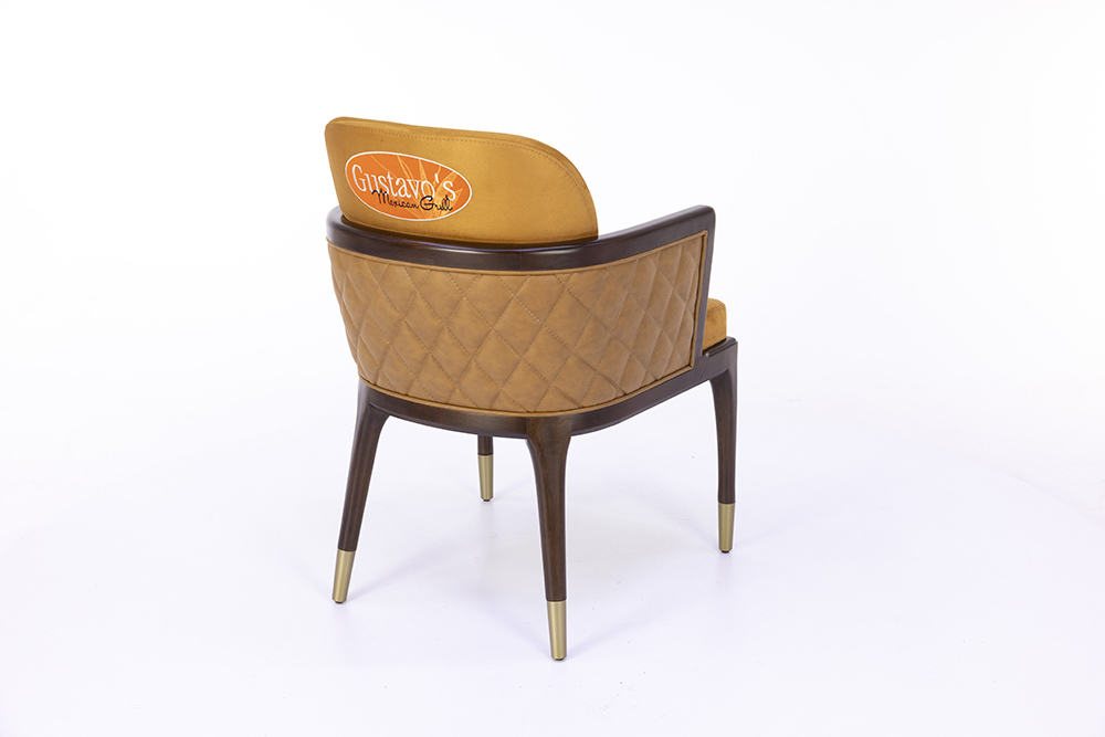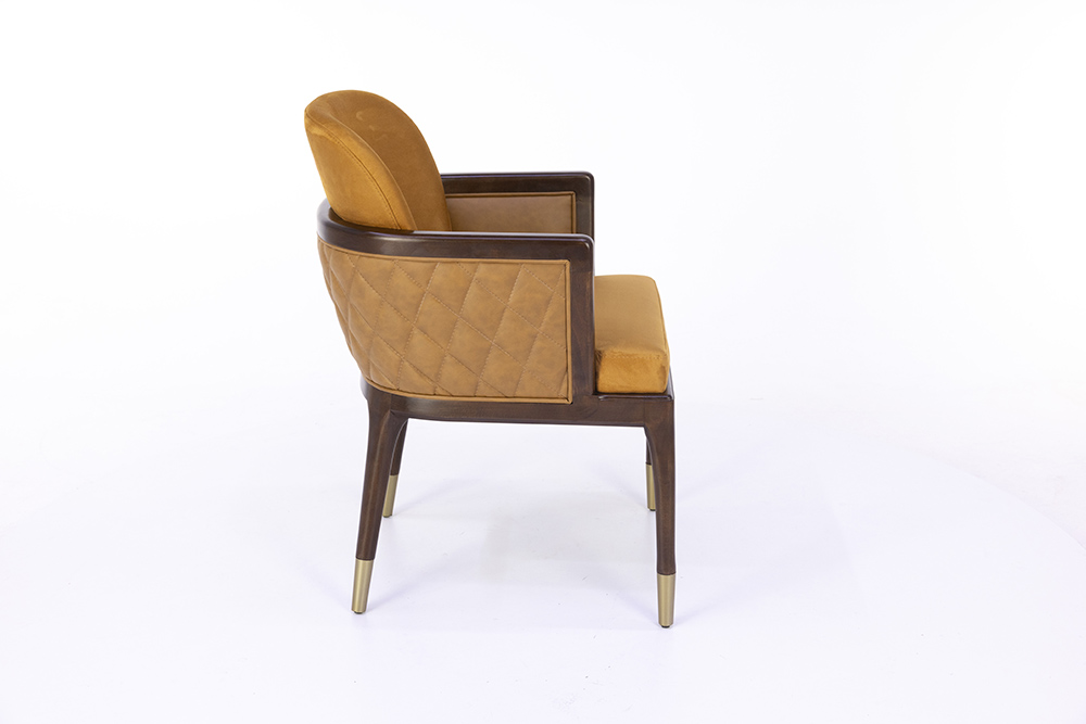 Dieser elegante Stuhl vereint ein edles Holzgestell mit einer hochwertigen Polsterung, die für ein komfortables Sitzerlebnis sorgt. Besonders die geschwungene Rückenlehne und die dezente Armlehnenführung verleihen ihm eine zeitlose Eleganz, die in gehobenen Gastronomie- oder Wohnbereichen bestens zur Geltung kommt. Die feinen Details an den Stuhlbeinen mit goldfarbenen Akzenten runden das Design ab und setzen stilvolle Highlights. Durch die verschiedenen Holzfarbtöne lässt sich der Stuhl harmonisch in unterschiedliche Einrichtungskonzepte integrieren. Er überzeugt nicht nur durch seine optische Wirkung, sondern auch durch seine stabile Verarbeitung, die eine lange Lebensdauer garantiert.