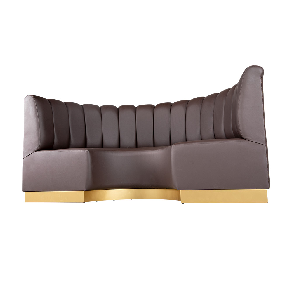 Dieses exklusive Ecksofa besticht durch seine geschwungene Form und die vertikal abgesteppten Rückenpolster, die für ein edles Erscheinungsbild sorgen. Der hochwertige Bezug bietet nicht nur optische Eleganz, sondern auch angenehmen Sitzkomfort. Besonders das markante Sockelelement in Goldoptik verleiht dem Möbelstück eine luxuriöse Ausstrahlung und macht es zu einem Blickfang in jeder gehobenen Einrichtung. Dank seiner stabilen Holzstruktur ist das Sofa langlebig und robust. Es eignet sich ideal für stilvolle Restaurants, Hotellobbys oder Lounges, in denen Komfort und repräsentatives Design gleichermaßen gefragt sind. Zudem lässt es sich durch seine modulare Bauweise harmonisch in unterschiedliche Raumkonzepte integrieren und schafft ein einladendes Ambiente für Gäste.