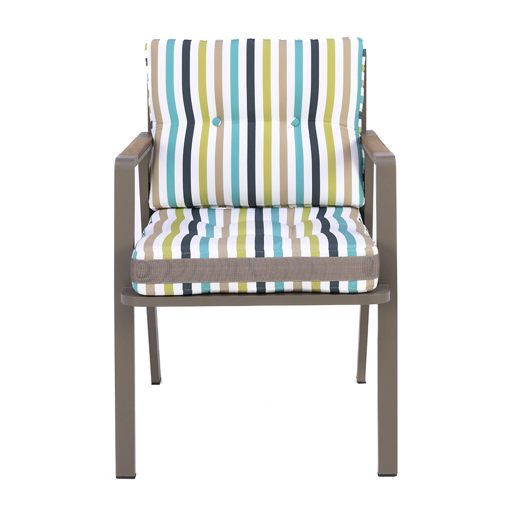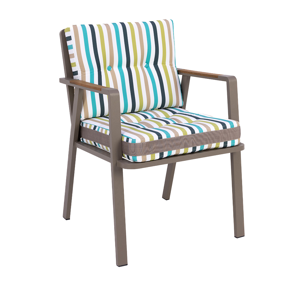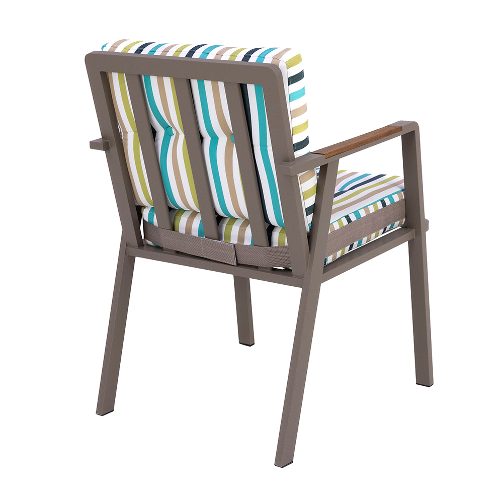 Dieser Stuhl verbindet modernes Design mit einem leichten Aluminiumrahmen, der Stabilität und Langlebigkeit garantiert. Die großzügig gepolsterten Sitz- und Rückenkissen bieten hohen Komfort und lassen sich in verschiedenen Stoffmustern und Farben anpassen. Dank der schlichten Linienführung und der warmen Holzoptik wirkt er gleichzeitig zeitlos und modern. Das geringe Gewicht macht ihn besonders praktisch und flexibel einsetzbar, sei es im Wohnbereich, in der Gastronomie oder auf der Terrasse. Mit seiner robusten Konstruktion und den witterungsbeständigen Materialien eignet er sich ideal für den intensiven Alltagseinsatz.