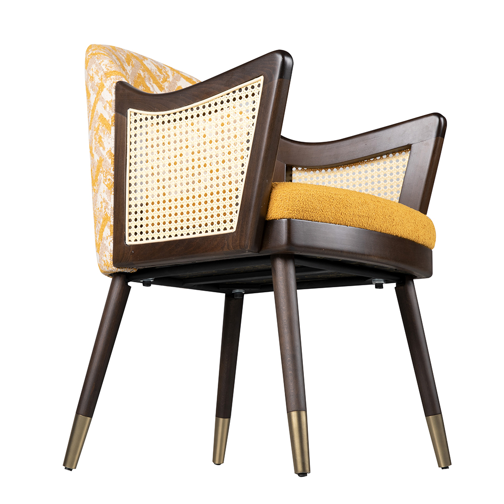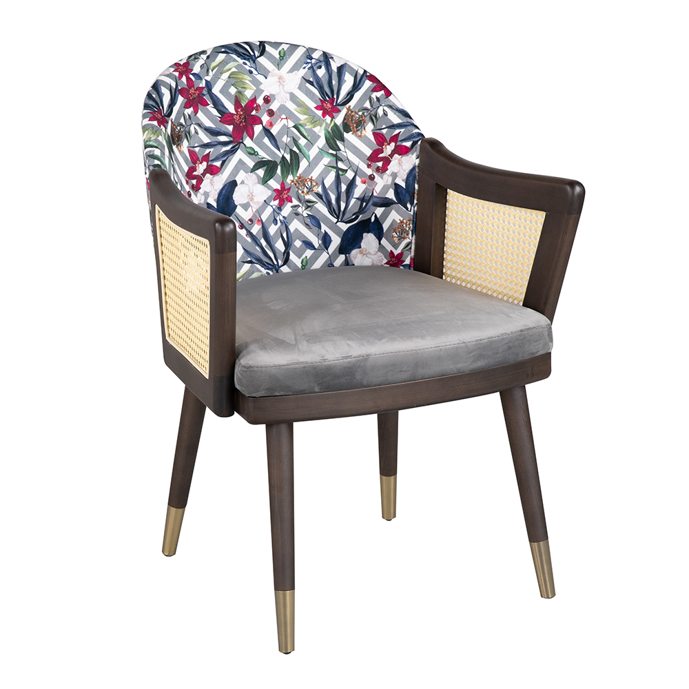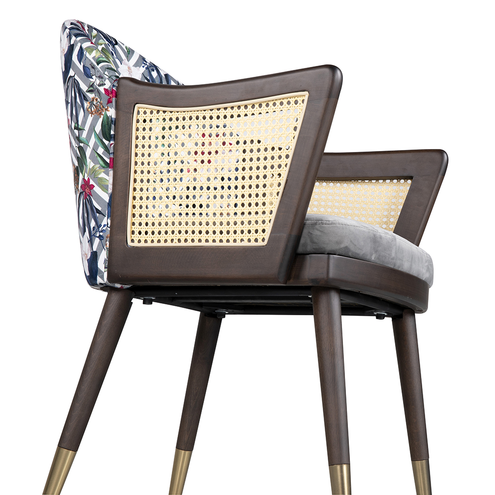 Dieser elegante Stuhl vereint traditionellen Charme mit modernem Komfort. Die geschwungene Rückenlehne mit edler Knopfheftung sorgt für eine stilvolle Optik, während die seitlichen Rattan-Elemente Leichtigkeit und Natürlichkeit ausstrahlen. Die gepolsterte Sitzfläche bietet angenehmen Komfort und macht den Stuhl sowohl für längeres Sitzen als auch für repräsentative Zwecke geeignet. Durch die Kombination von Holz, Rattan und hochwertigem Stoff entsteht ein zeitloses Möbelstück, das sich vielseitig in klassische wie auch moderne Interieurs integrieren lässt. Besonders in Restaurants, Cafés oder Lounges setzt dieser Stuhl einen stilvollen Akzent und verbindet Ästhetik mit Alltagstauglichkeit.