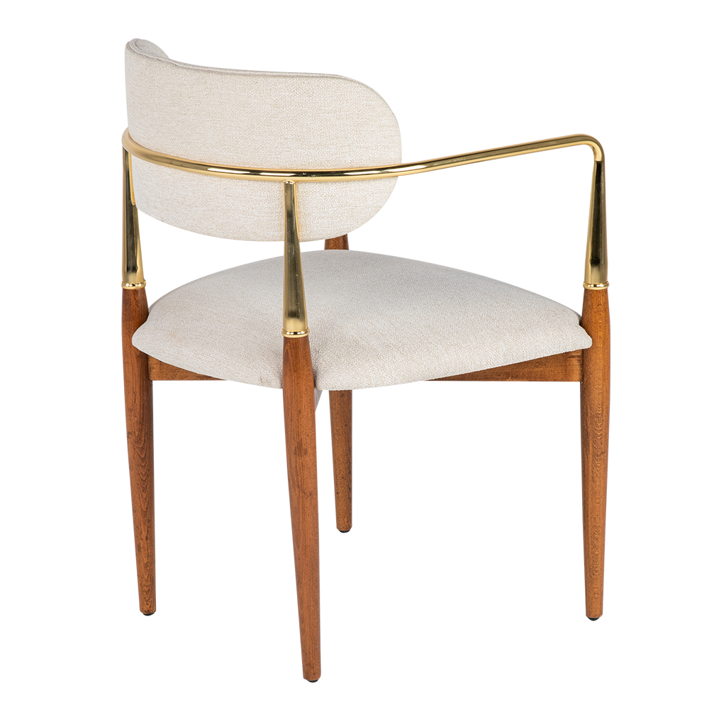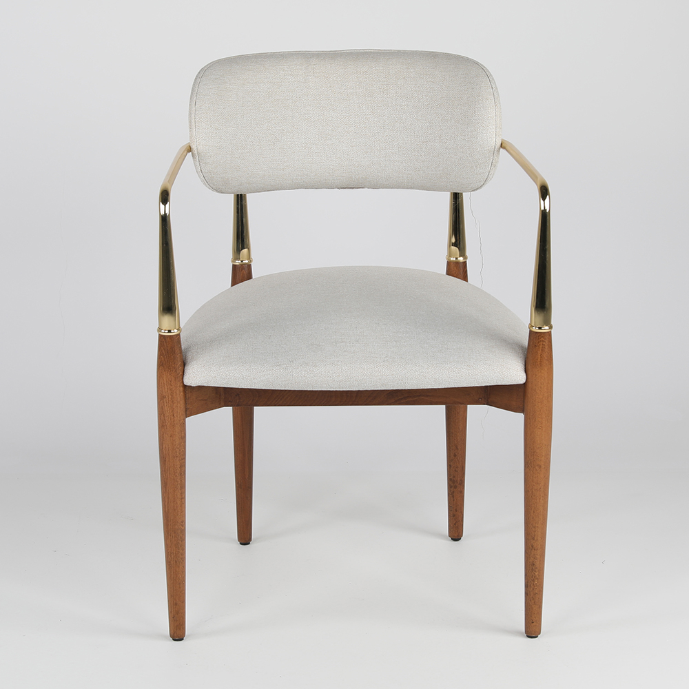 Dieser elegante Stuhl mit Armlehnen und Holzbeinen verbindet modernes Design mit zeitloser Raffinesse. Die schlanke Silhouette, kombiniert mit den dezenten Armlehnen, verleiht ihm Leichtigkeit und gleichzeitig Stabilität. Die gepolsterte Sitzfläche und Rückenlehne sorgen für hohen Komfort, während die edlen Holzelemente Wärme und Natürlichkeit ausstrahlen. Durch die harmonische Verbindung von Stoff und Holz eignet er sich sowohl für gehobene Essbereiche als auch für stilvolle Lounge- oder Empfangsräume. Ein vielseitiges Möbelstück, das Komfort und Design auf ideale Weise vereint.