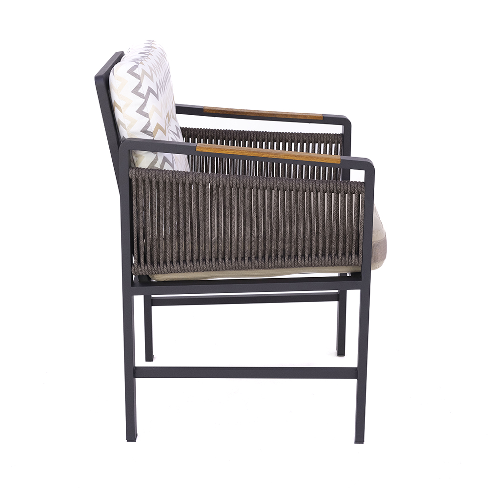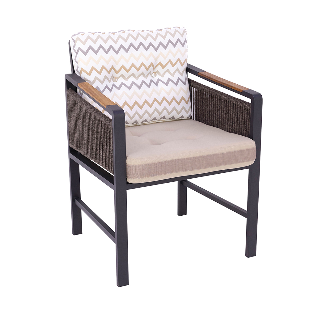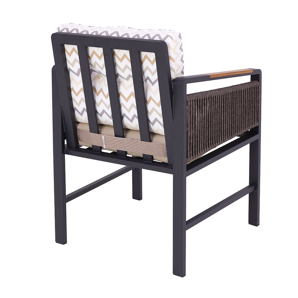 Dieser Stuhl vereint modernes Design mit hoher Alltagstauglichkeit. Das stabile Aluminiumgestell sorgt für Robustheit, während die seitlichen Bespannungen dem Modell eine stilvolle Note verleihen. Die großzügige Sitzfläche sowie die weichen Sitz- und Rückenkissen mit trendigem Muster bieten höchsten Komfort und laden zum Verweilen ein. Dank seiner wetterfesten Materialien eignet er sich sowohl für den Innen- als auch für den Außenbereich. Mit seiner klaren Formensprache und den hochwertigen Polstern setzt er in jeder Umgebung einen eleganten Akzent. Ein vielseitiger Begleiter, der Stil und Bequemlichkeit perfekt verbindet.