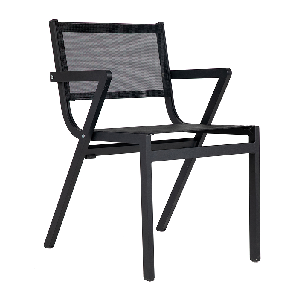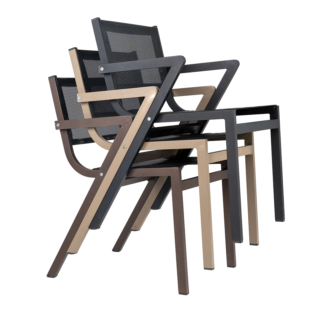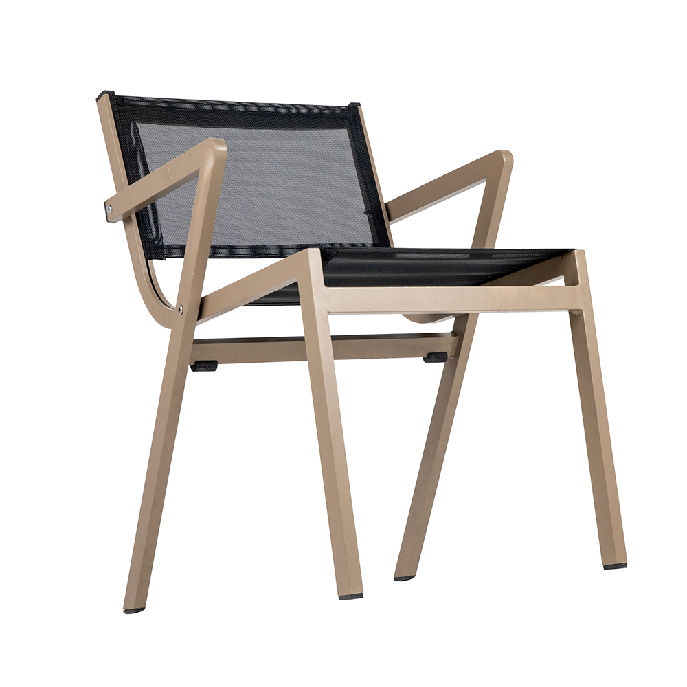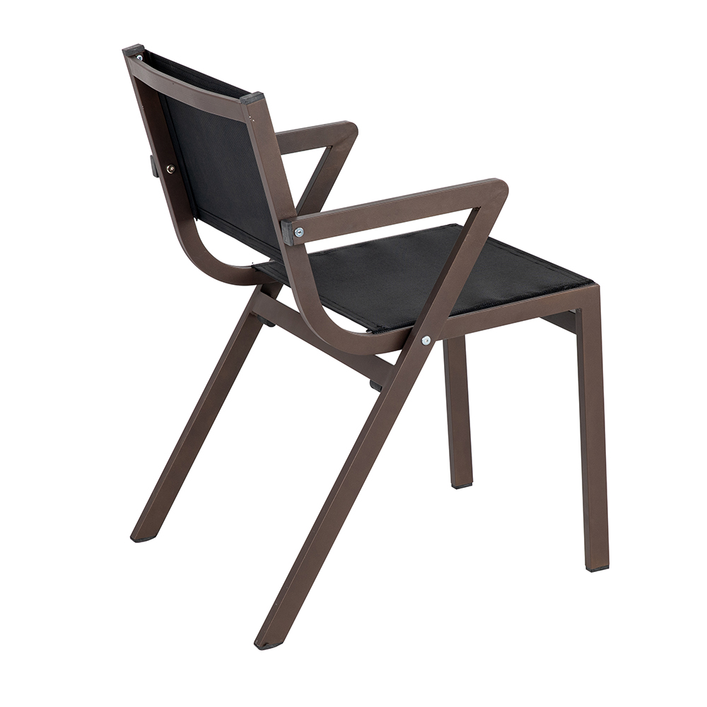 Dieser Stuhl kombiniert modernes Design mit funktionaler Robustheit. Das stabile Aluminiumgestell verleiht ihm eine hohe Langlebigkeit, während die Bespannung von Sitz- und Rückenfläche angenehm leicht und komfortabel ist. Dezente Armlehnen mit Holzdetails setzen einen warmen Akzent und sorgen für ein stilvolles Erscheinungsbild. Dank seiner wetterfesten Materialien eignet er sich ideal für den Einsatz im Freien und ist gleichzeitig pflegeleicht und stapelbar, was ihn besonders praktisch für Gastronomie und private Terrassen macht. Durch seine klare Formensprache fügt er sich harmonisch in unterschiedliche Umgebungen ein und bietet sowohl Komfort als auch Flexibilität. Ein vielseitiger Stuhl, der Eleganz und Alltagstauglichkeit perfekt verbindet.