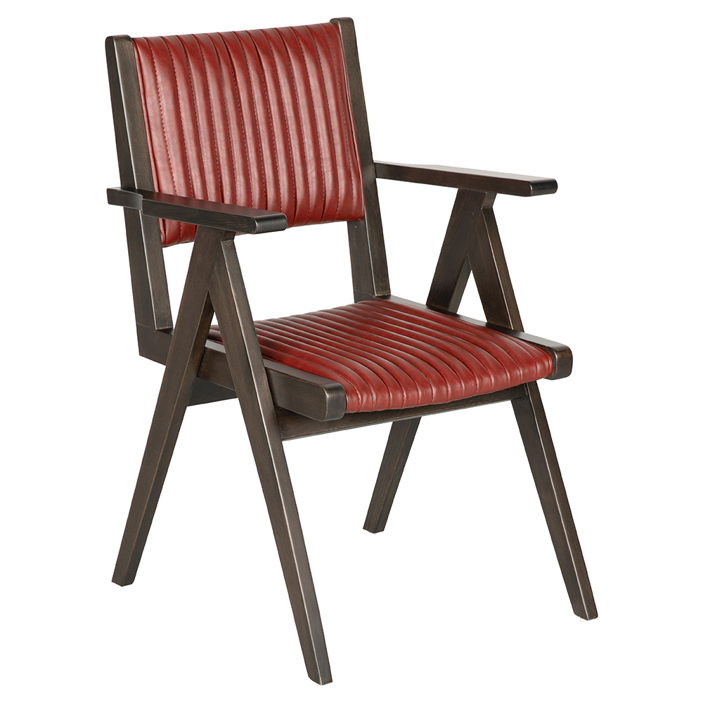 Dieser markante Stuhl verbindet Retro-Charme mit robustem Komfort. Sitzfläche und Rückenlehne sind gepolstert und mit vertikalen Steppnähten versehen, die für einen klassischen Look sorgen. Die integrierten Armlehnen erhöhen den Sitzkomfort und machen das Modell ideal für längere Sitzzeiten.