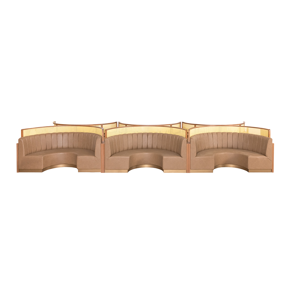 Dieses halbrunde Sofa-Element vereint modernes Design mit exklusiver Eleganz und bietet großzügigen Platz für mehrere Personen. Die hohe, gepolsterte Rückenlehne mit vertikaler Struktur sorgt für Komfort und zugleich für einen stilvollen Auftritt. Durch die massive Holzkonstruktion erhält das Möbelstück Stabilität und Wertigkeit, während die warme Farbgebung eine einladende Atmosphäre schafft. Ideal geeignet ist es für gehobene Gastronomie, Lounges oder repräsentative Empfangsbereiche, in denen Komfort und Design im Mittelpunkt stehen. Erhältlich ist es in den Holzvarianten Natur-Eiche, Hell-Nussbaum und Nussbaum. Zum Preis von dreitausend Euro stellt es eine hochwertige Investition in Ambiente und Funktionalität dar.