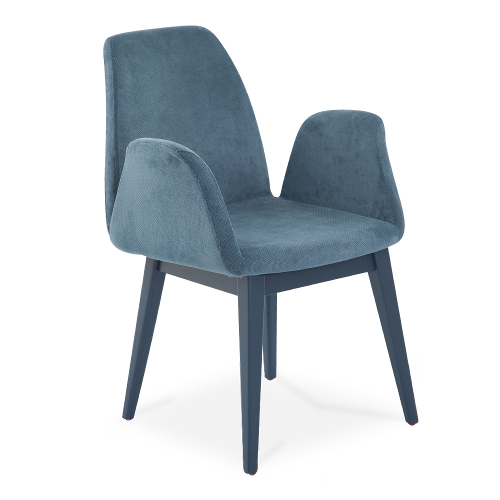 Ein eleganter Stuhl mit weich gepolsterter Sitzfläche und formschönen Armlehnen, die zusätzlichen Komfort bieten. Die massiven Holzbeine garantieren Stabilität und verleihen dem Modell eine warme, natürliche Ausstrahlung. Dank seiner klaren Linien fügt er sich harmonisch in Esszimmer, Gastronomie oder repräsentative Bürobereiche ein. Verschiedene Holzfarben ermöglichen eine individuelle Anpassung an jedes Raumkonzept. So entsteht ein vielseitiges Möbelstück, das zeitlose Eleganz mit funktionaler Alltagstauglichkeit verbindet.