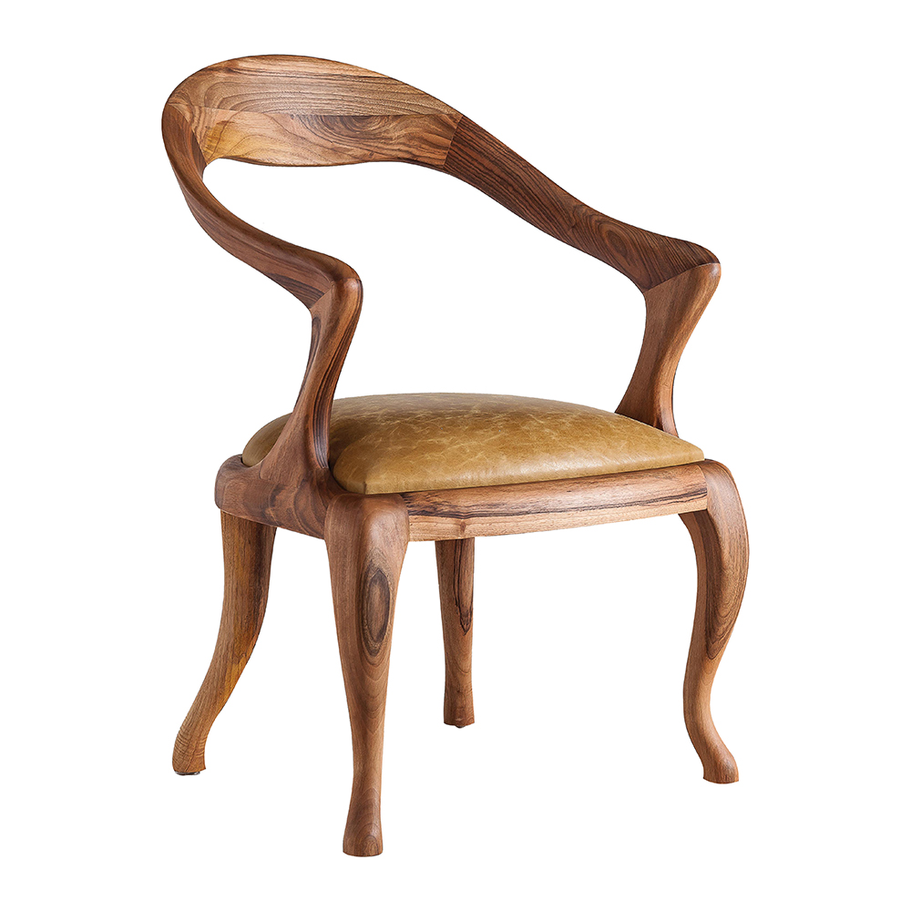 Dieser elegante Armlehnenstuhl besticht durch seine außergewöhnlich geschwungene Form und die kunstvolle Verarbeitung des Holzes. Die geschwungenen Linien von Rückenlehne und Beinen verleihen ihm eine fast skulpturale Anmutung und machen ihn zu einem echten Blickfang in jedem Raum. Die Sitzfläche ist bequem gepolstert und sorgt für angenehmen Komfort, während die Auswahl an Holzfarben von Natur über hellen bis hin zu dunklem Nussbaum vielfältige Gestaltungsmöglichkeiten eröffnet. Mit weniger als zehn Kilogramm ist der Stuhl leicht und dennoch stabil, wodurch er sich flexibel einsetzen lässt. Durch sein markantes Design eignet er sich sowohl für stilvolle Esszimmer als auch für repräsentative Lounges oder Empfangsbereiche. Damit vereint er Funktionalität mit einem besonderen künstlerischen Ausdruck.