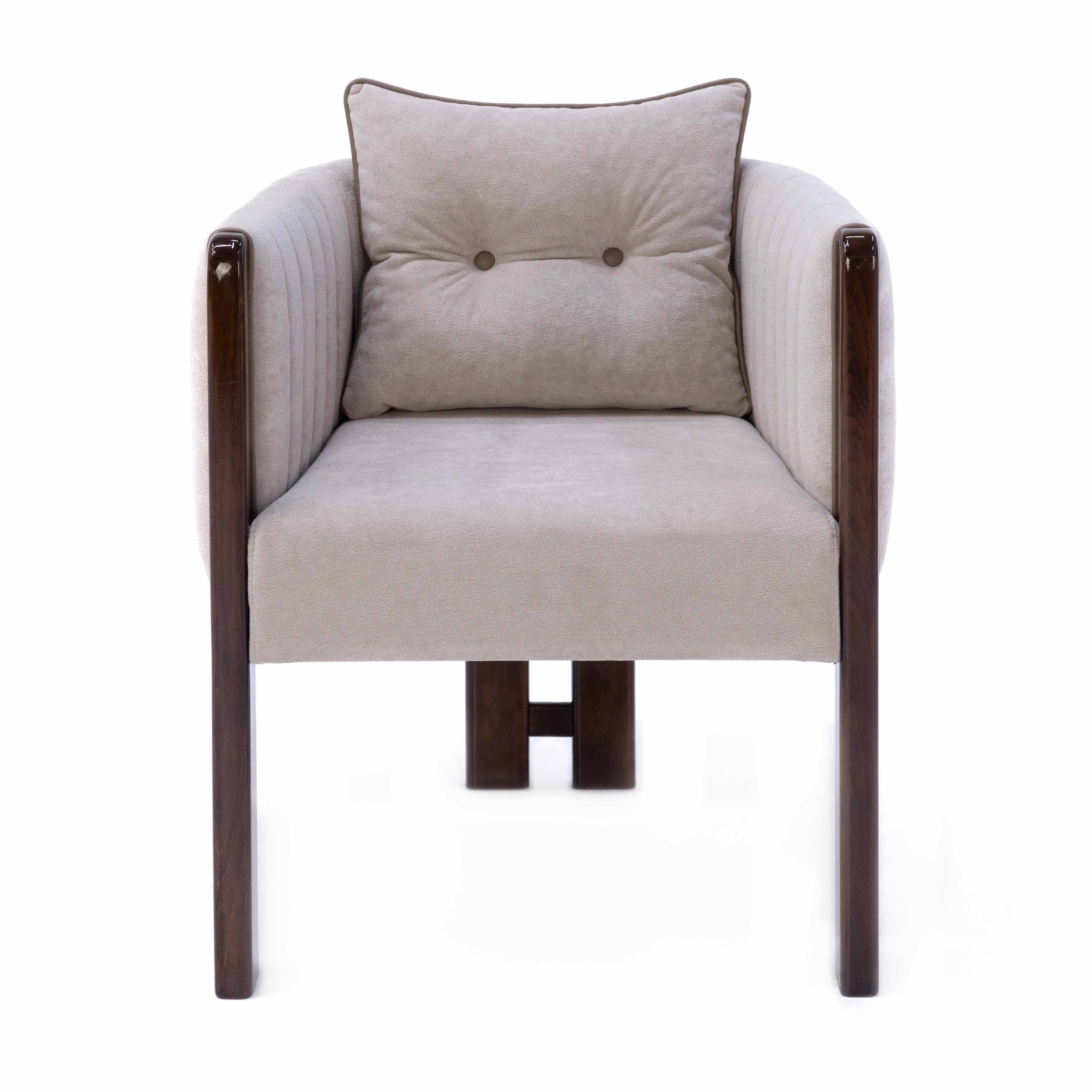 Dieser Stuhl vereint modernes Design mit höchstem Sitzkomfort. Die umlaufende, weich gepolsterte Rückenlehne mit dekorativen Steppnähten verleiht ihm eine einladende und elegante Ausstrahlung. Das solide Holzgestell sorgt für Stabilität und kann in verschiedenen Holzfarben wie Natur-Eiche, heller Nussbaum oder dunkler Nussbaum gewählt werden. Durch das zusätzliche Kissen wird die Sitzfläche besonders bequem und bietet eine angenehme Unterstützung. Ein vielseitiges Möbelstück, das sich sowohl für stilvolle Wohnbereiche als auch für gehobene Gastronomiekonzepte eignet.