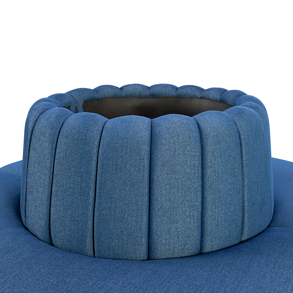 Dieses Modell ist ein echtes Highlight für repräsentative Räume und kombiniert luxuriöses Design mit hohem Sitzkomfort. Die runde Form mit umlaufender Sitzfläche schafft ein einladendes Zentrum für Empfangsbereiche, Hotellobbys oder großzügige Lounges. Die elegante Polsterung in edlem Blau wird durch die vertikale Absteppung stilvoll betont und wirkt gleichzeitig modern wie klassisch. Besonders edel zeigt sich das goldfarbene Sockelelement, das dem Möbelstück eine exklusive Note verleiht und für einen Hauch von Luxus sorgt. Dank seiner zentralen Platzierungsmöglichkeit eignet es sich ideal, um offene Räume zu strukturieren und Gästen einen stilvollen Aufenthaltsort zu bieten.