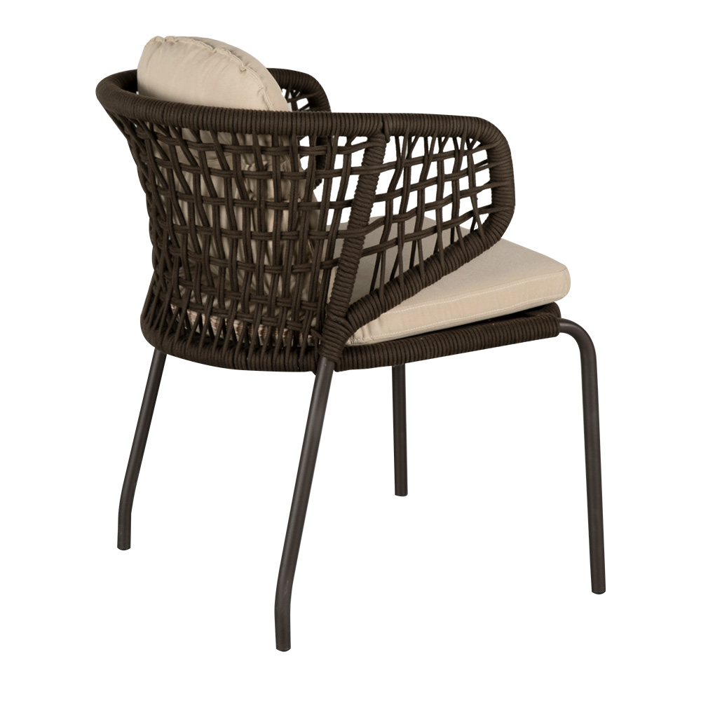 Dieser Stuhl kombiniert ein modernes Flecht-Design mit hohem Sitzkomfort. Die offene Struktur der Rücken- und Seitenlehnen verleiht ihm eine luftige Leichtigkeit, während die bequemen Polster für angenehmes Sitzen sorgen. Das stabile Gestell gibt Halt und macht ihn zu einer langlebigen Wahl für Essbereiche, Wintergärten oder stilvolle Außenflächen. Durch die harmonische Verbindung von klarer Linienführung und gemütlicher Ausstrahlung eignet er sich sowohl für private Wohnräume als auch für die Gastronomie. Ein vielseitiges Möbelstück, das Funktionalität und Design elegant vereint.