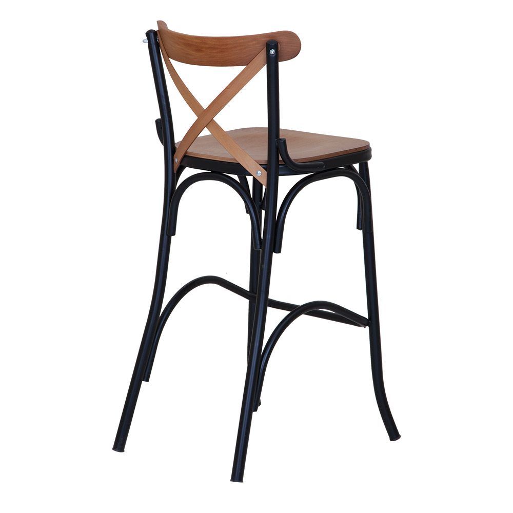 Dieser Barstuhl vereint industriellen Charme mit klassischer Linienführung. Die markante Kreuzlehne sorgt für ein stilvolles Detail, während die erhöhte Sitzposition mit Fußstütze Komfort auch bei längerem Sitzen garantiert. Das stabile Metallgestell bietet Standfestigkeit, die Holzflächen in Natur-Eiche, Light Walnut oder dunklem Walnut setzen warme Akzente. Ideal für Bars, Cafés und Kücheninseln, die eine Kombination aus Langlebigkeit, Funktionalität und Design schätzen.