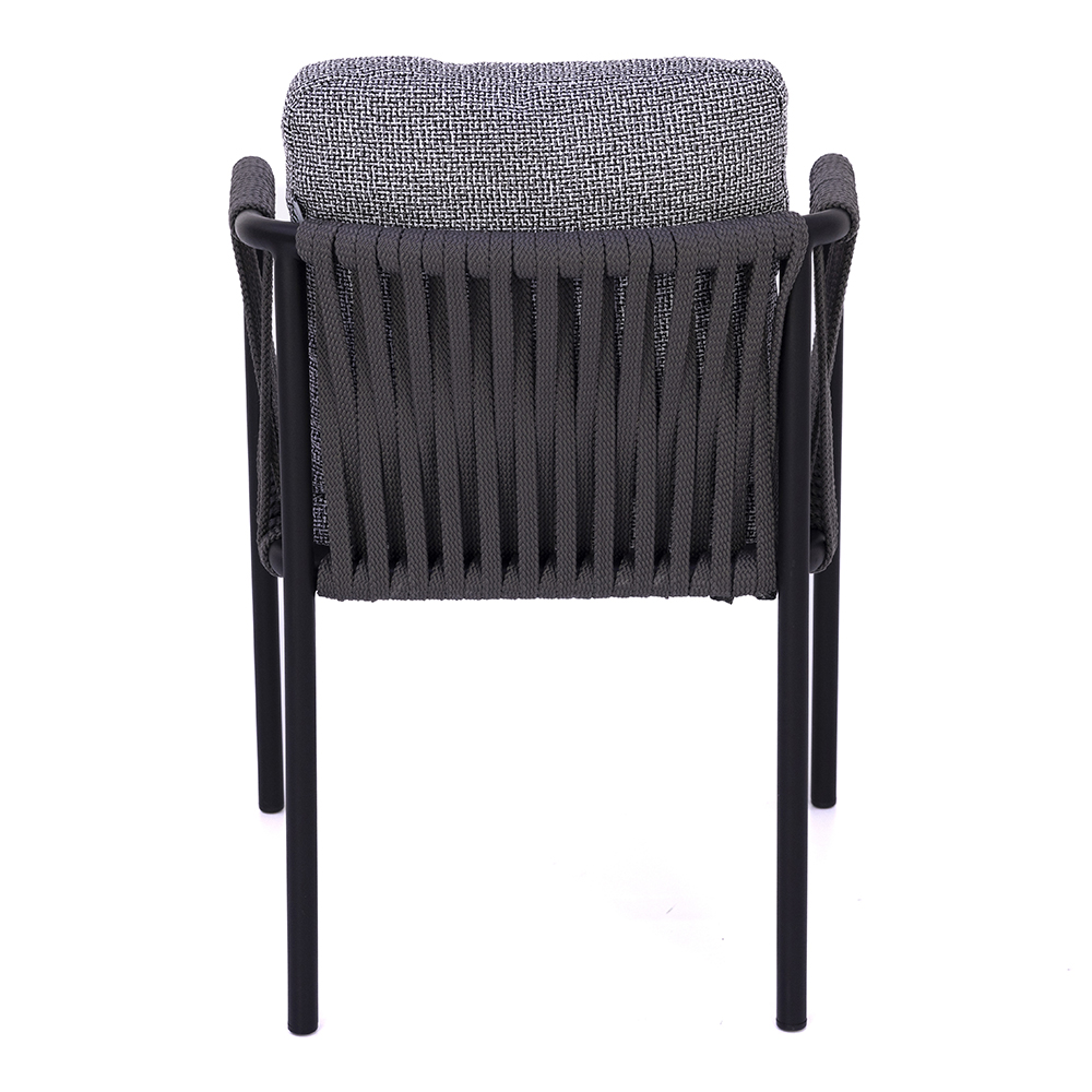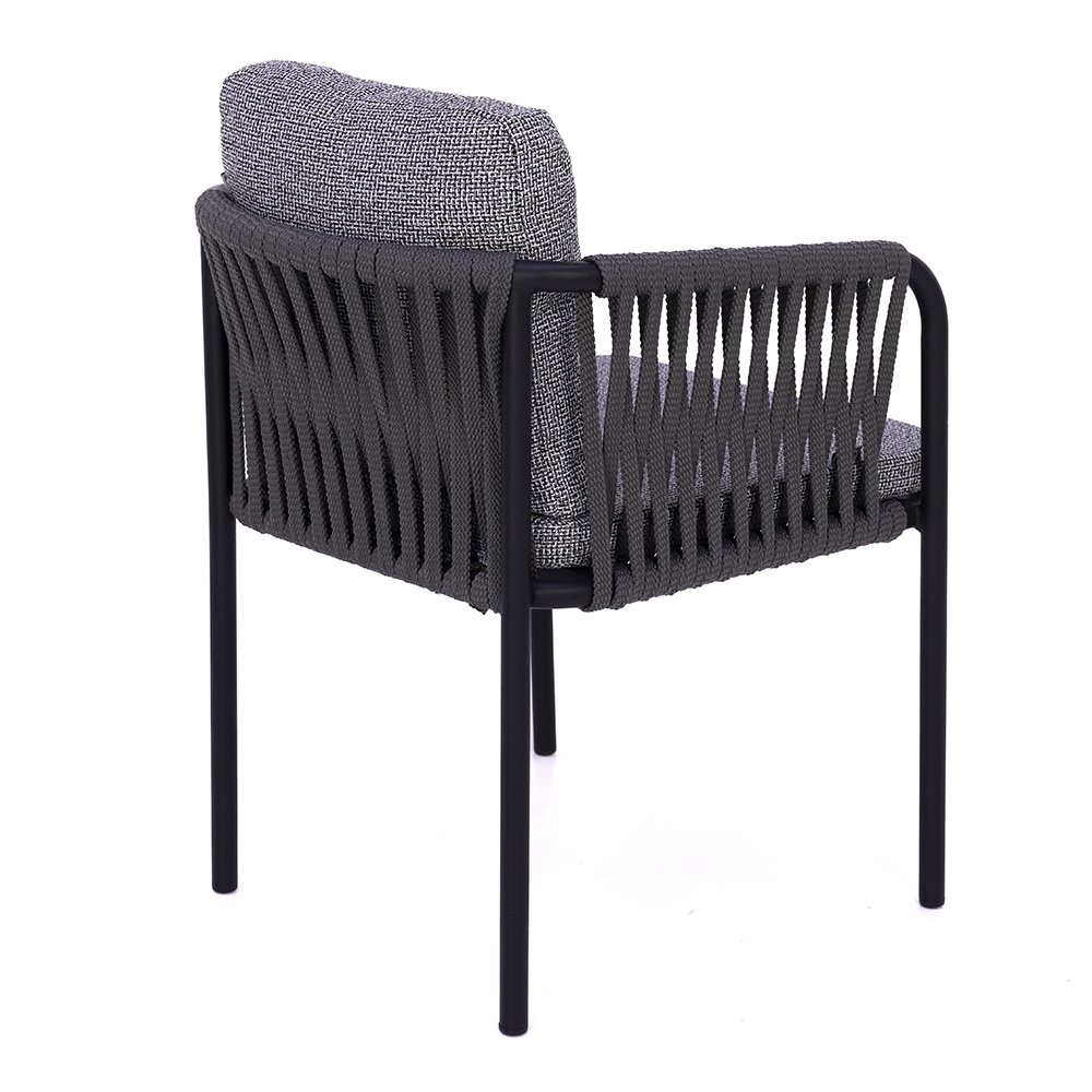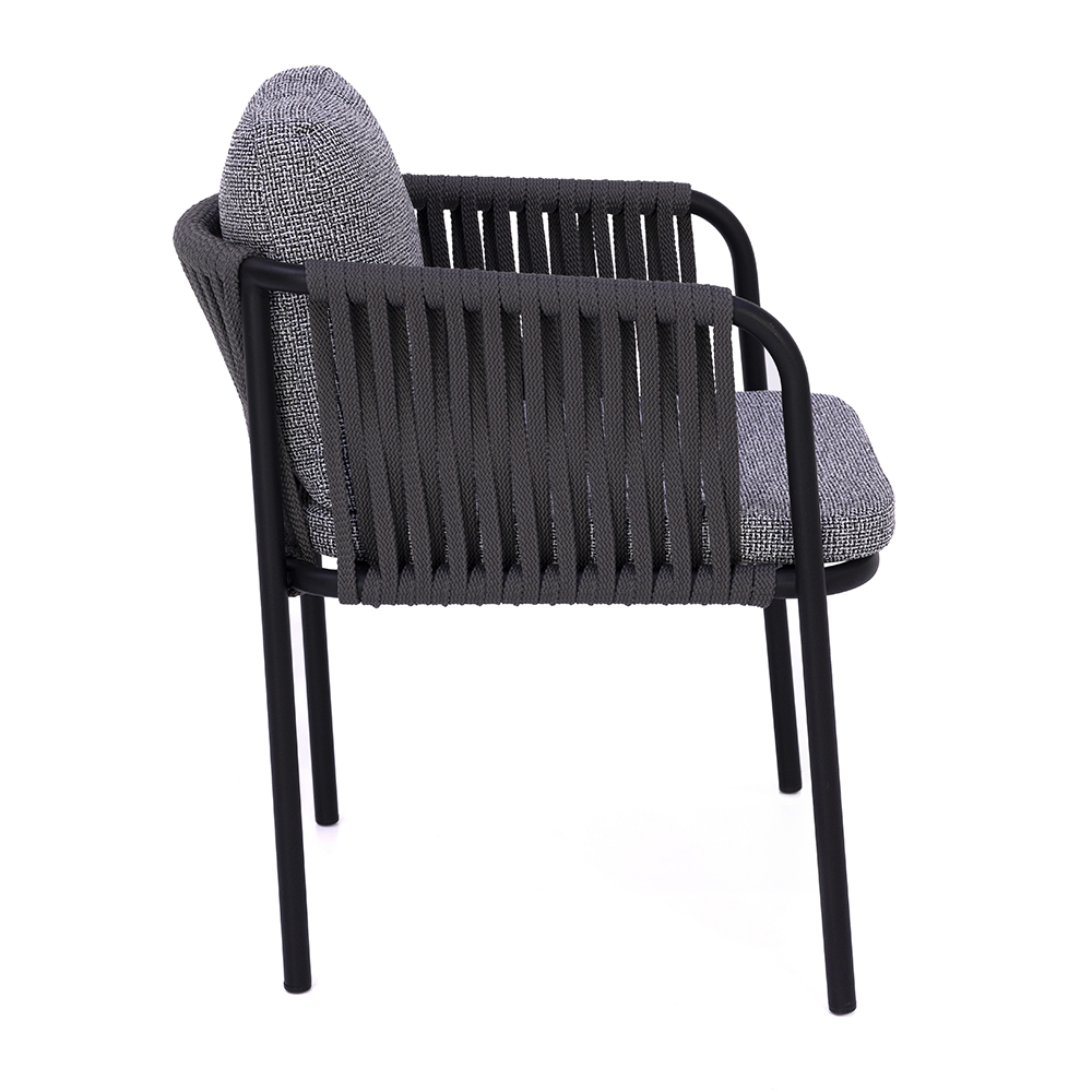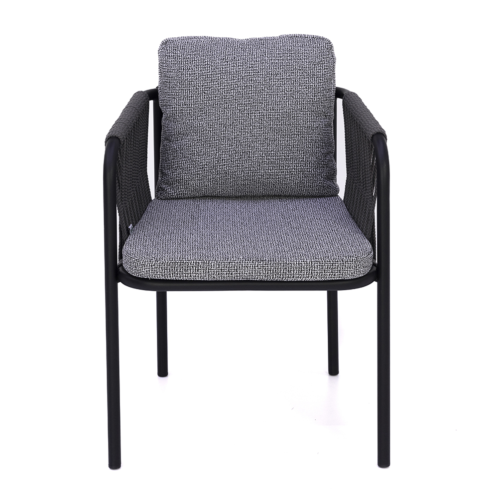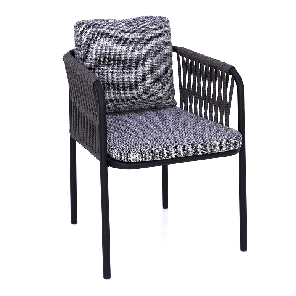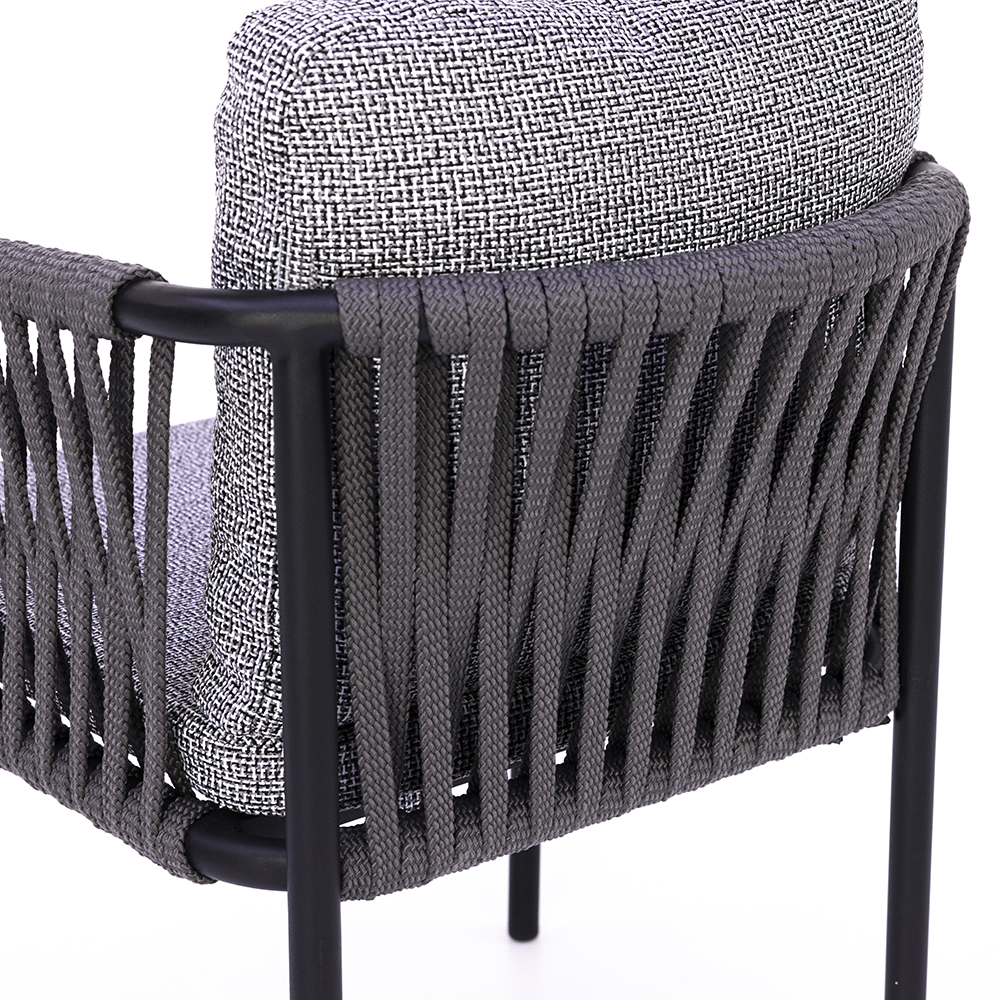 Dieser Stuhl überzeugt durch seine elegante Mischung aus moderner Optik und hoher Funktionalität. Das Gestell aus pulverbeschichtetem Metall sorgt für Stabilität und eine lange Lebensdauer, während die seitlich geflochtenen Elemente dem Design Leichtigkeit und Raffinesse verleihen. Die großzügig gepolsterten Sitz- und Rückenkissen bieten höchsten Komfort und laden zu entspannten Momenten ein. Mit seiner zeitlosen Farbgebung fügt er sich harmonisch in verschiedene Einrichtungskonzepte ein – sowohl im Innen- als auch im Außenbereich. Durch die Kombination von Robustheit und wohnlichem Charakter ist er eine vielseitige Wahl für Gastronomie, Hotellerie oder den privaten Wohnraum.