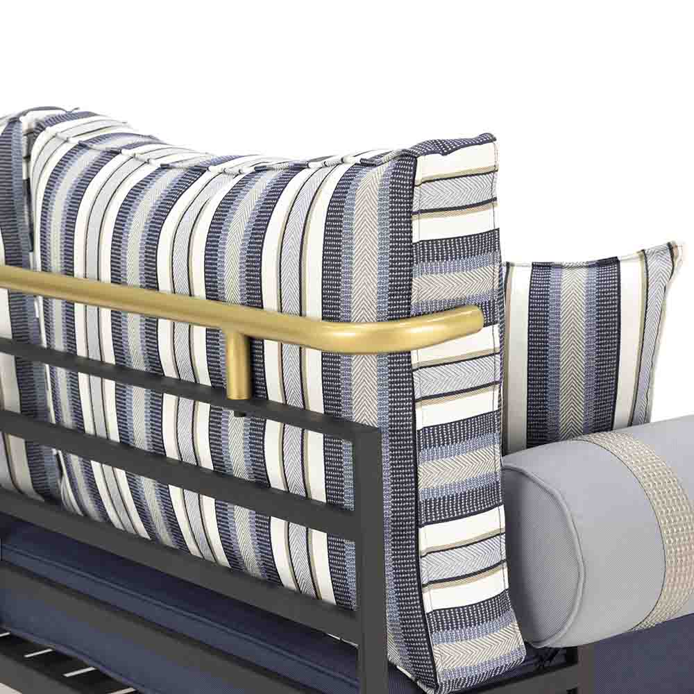 Dieses moderne Sofa kombiniert ein markantes Metallgestell mit goldfarbenen Akzenten und verleiht jedem Raum einen stilvollen, urbanen Look. Die großzügige Polsterung und die zahlreichen Kissen in elegantem Streifenmuster sorgen für hohen Sitzkomfort und eine einladende Atmosphäre. Durch die klare Linienführung wirkt das Design gleichzeitig modern und zeitlos, sodass es sich sowohl in klassische als auch in zeitgenössische Einrichtungen integrieren lässt. Ein Statement-Möbelstück, das Komfort und Eleganz perfekt vereint und durch seine hochwertige Verarbeitung langlebig und pflegeleicht bleibt. Ideal für Wohnräume, Lounges oder stilvolle Wartebereiche, in denen sowohl Ästhetik als auch Bequemlichkeit gefragt sind.